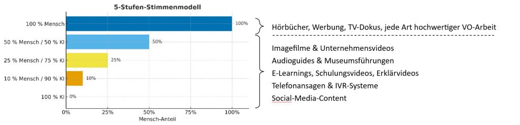 Daher sind die Hybrid-Modelle wie auch die vollständig KI-basierte Lösung nicht für hochwertige Voice-Over-Arbeiten wie Hörbücher, Werbung oder TV-Dokumentationen geeignet, bei denen die emotionale Tiefe einer echten Stimme unverzichtbar bleibt.