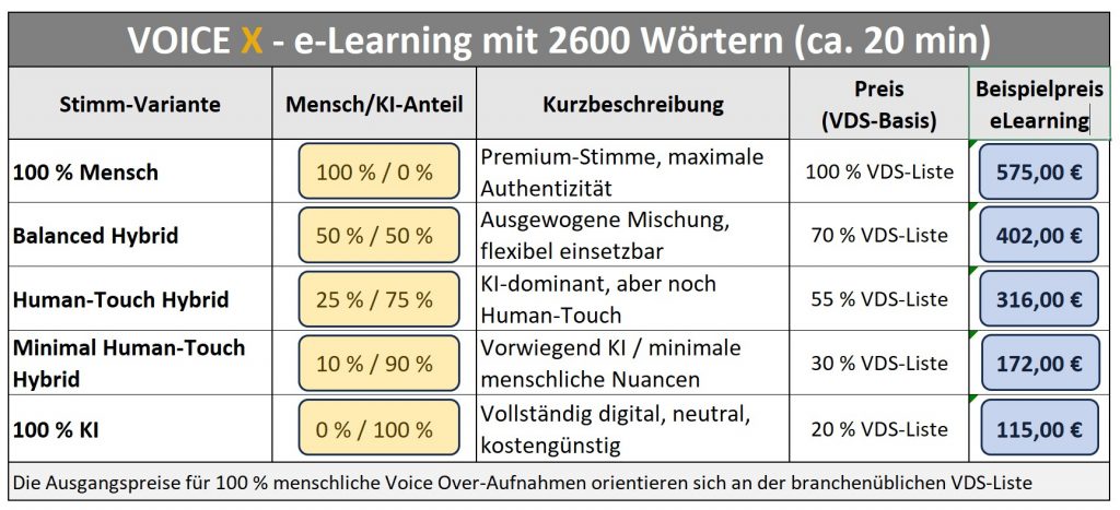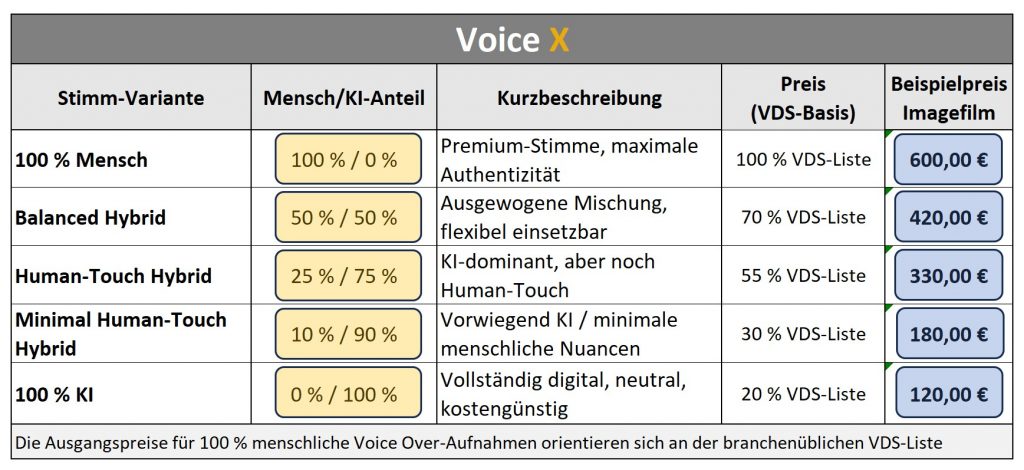 Geht es aber um kostenbewussten Einsatz in Imagefilmen, Unternehmensvideos, Audio-Guides, Museumsführungen, E-Learnings, Schulungsvideos, Erklärvideos, TV-Ansagen, IVR-Systemen oder für Social-Media-Content bietet VOICEX jedoch interessante Möglichkeiten. Je nach Projekt können hybride Formen, bei denen menschliche und KI-Anteile kombiniert werden, eine attraktive Lösung darstellen.